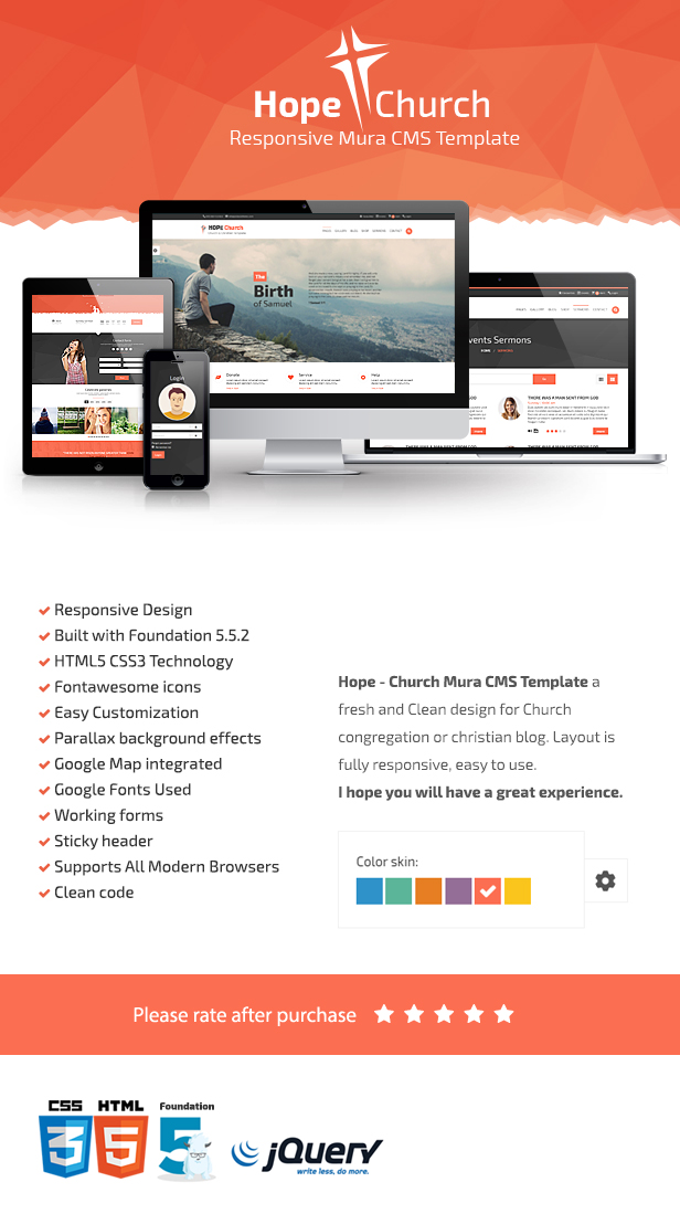 Hope – Church Responsive HTML5 MuraCMS theme a fresh & clean design for Church, congregation or any religious blog. Layout is fully responsive, easy to use and easy customize. It includes Blog, Gallery, Sermons, Contact login & more pages.
