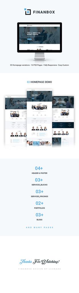 Welcome to my theme page! FINANBOX – Multipurpose Business & Corporate Business PSD Template. You can customize it very easy to fit your business needs. If you like my theme, please rate it 5 stars. It’s very useful for me.